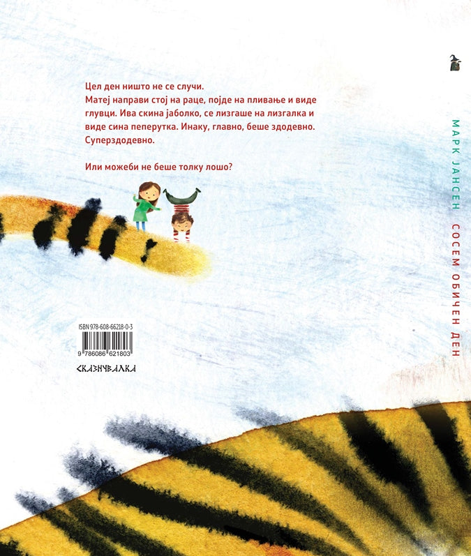Цел ден ништо не се случи. Матеј направи стој на раце, појде на пливање и виде глувци. Ива скина јабололко, се лизгаше на лизгалка и виде сина пеперутка. Инаку, главно, беше здодевно. Суперздодевно.