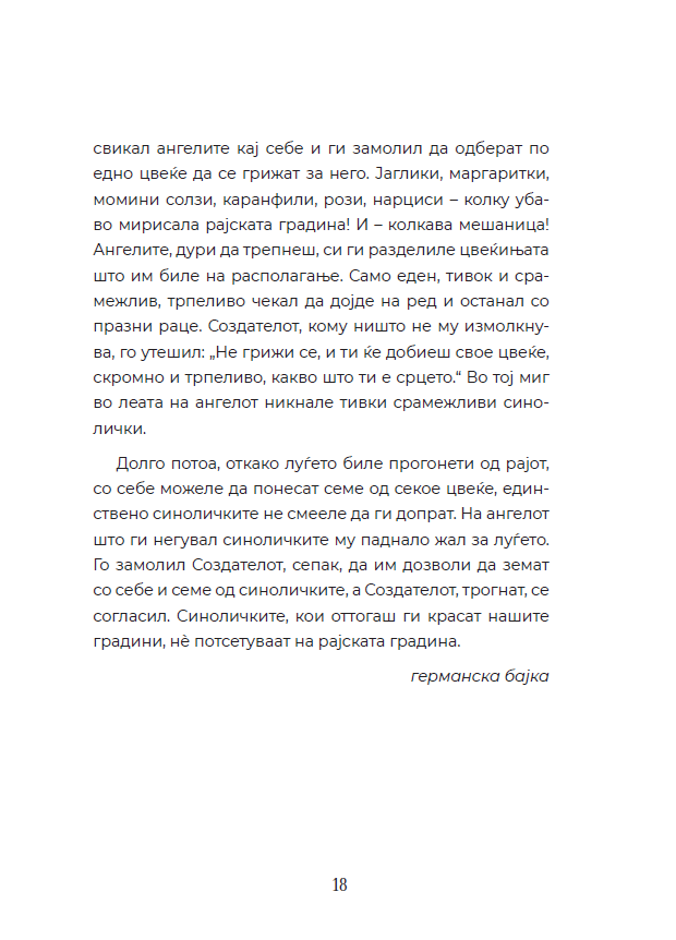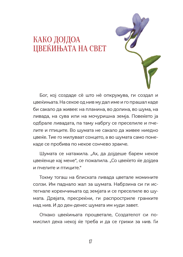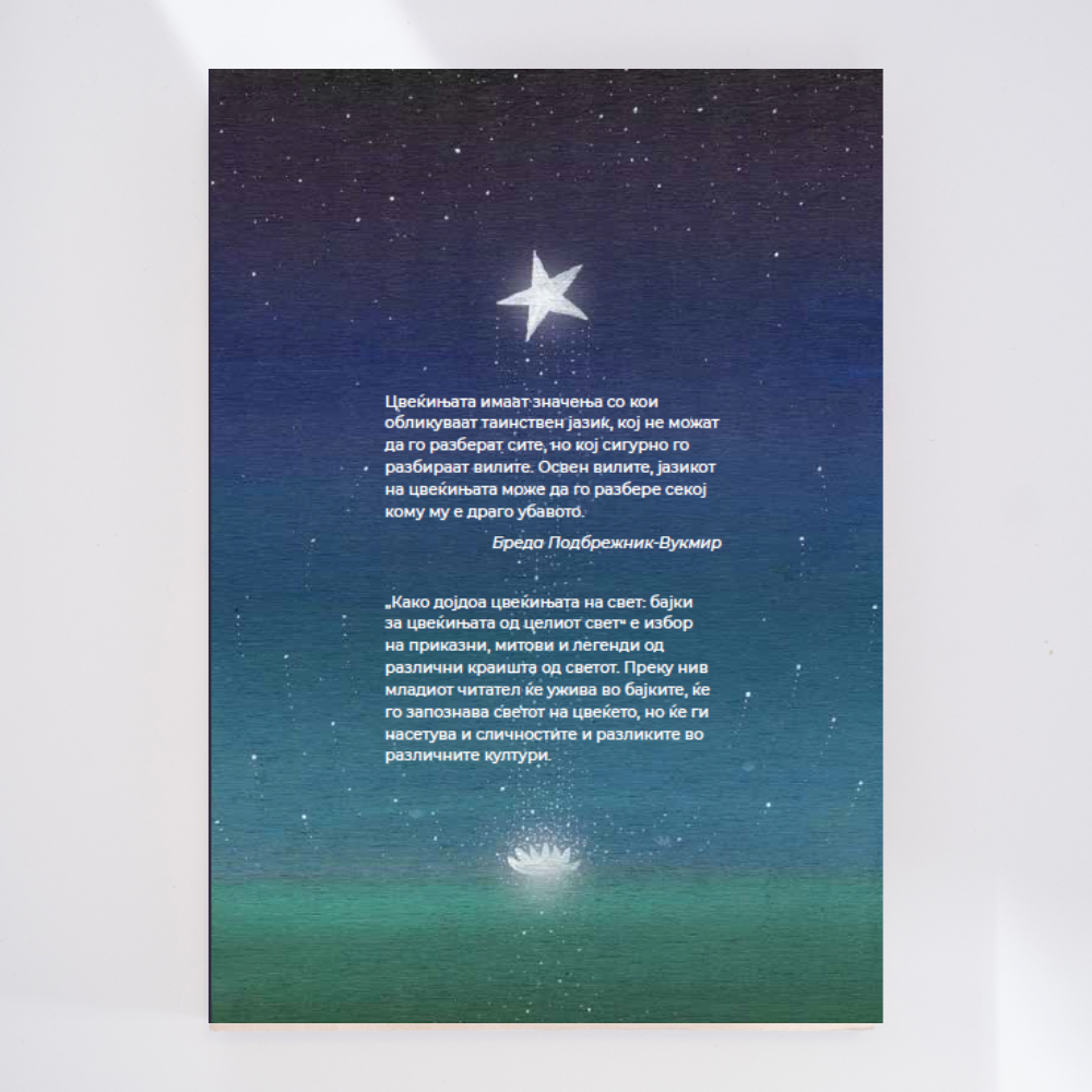 „Како дојдоа цвеќињата на свет: бајки за цвеќињата од целиот свет“ е избор на приказни, митови и легенди од различни краишта од светот. Преку нив младиот читател ќе ужива во бајките, ќе го запознава светот на цвеќето, но ќе ги насетува и сличностите и разликите во различните култури.